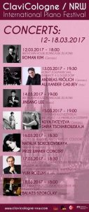 Das Clavicologne NRW – internationale Klavierfestival und -Wettbewerb fand vom 4. bis 16. März 2017 an der Hochschule für Musik und Tanz Köln statt. Der Clavicologne internationale Klaviewettbewerb wird in drei Altersklassen nach dem Meisterkurs durchgeführt, wobei sich die Teilnehmer vor einer internationalen renommierten Jury präsentieren müssen.