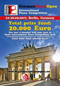 Der zweite Piano Open Competition fand vom 12. bis 16. September 2017 in der fantastischen Stadt Berlin, Deutschland, statt! Durch die ideale Lage, den lukrativen Preisen und weltberühmten Professoren als Mitglieder der Jury vom Festival, werden ideale Bedingungen und Atmosphäre für alle Bewerber und Musikliebhaber gebote!